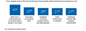 Employers already invest heavily in health and retirement benefits for employees to help them secure a financial future, so the natural continuation of this investment is to help employees with short-term and long-term financial planning and with financial solutions to help employees reach their financial goals. The 2020 Workplace Benefits Report from Bank of America says that 41% of employees think getting advice from a financial advisor would be one of the most important things an employer can offer. (3)
