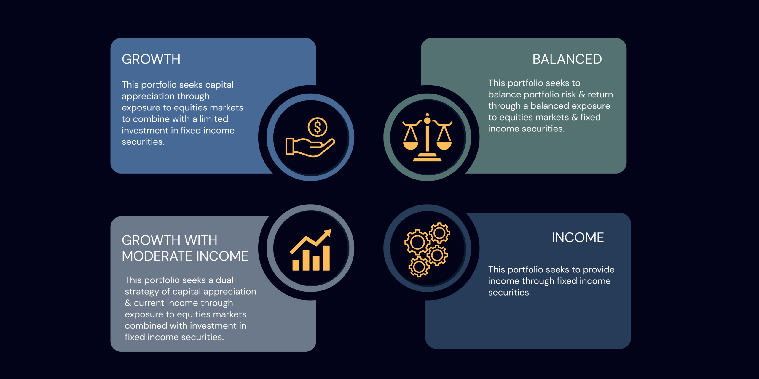 Our financial advisors and in-house investment management team will provide clients with professional asset management that puts our clients’ needs first and ensures their portfolio remains in alignment with their financial goals, risk tolerance and timeframe. Our models have the potential to provide asset growth while protecting against downside risk.