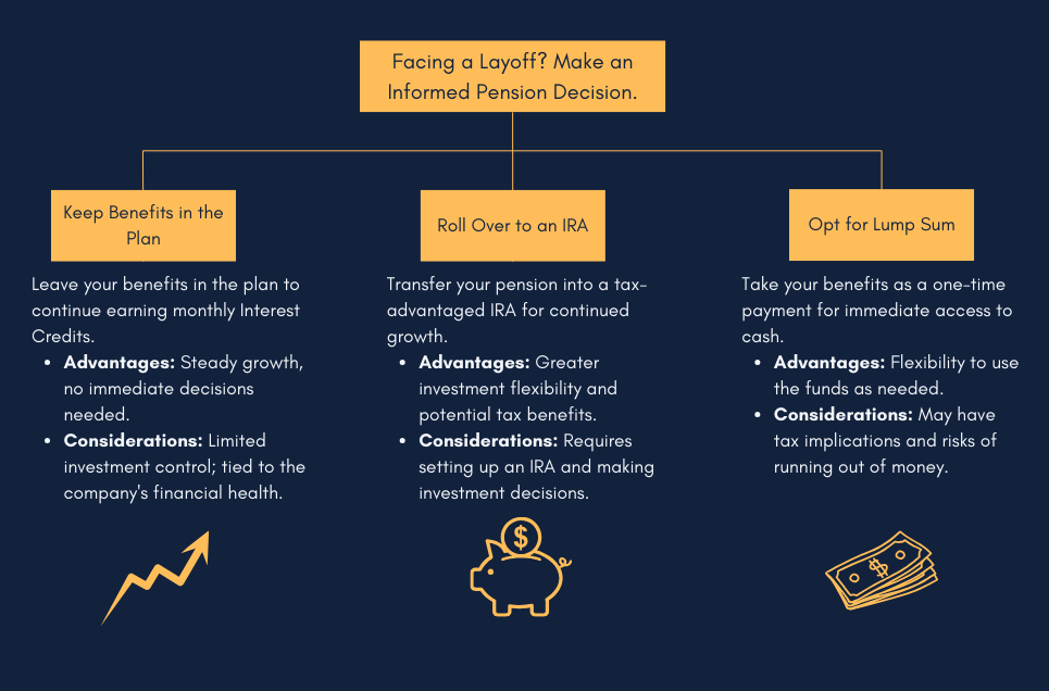 If you are laid off, your pension remains secure if you are vested. You may still have the option to leave it in the plan, roll it over, or take a lump sum. Understanding these options is critical for protecting your retirement savings.
